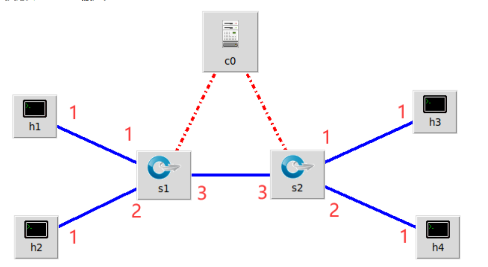 (2) 利用Mininet平台搭建下图所示网络拓扑,要求支持OpenFlow 1.3协议,主机名、交换机名以及端口对应正确。拓扑生成后需连接Ryu,且Ryu应能够提供REST API服务。