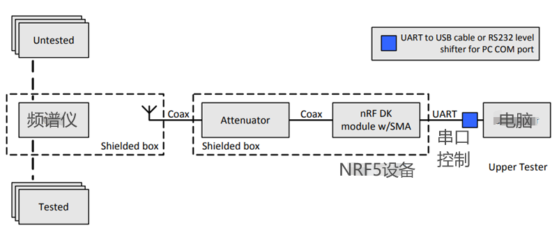 BLE设备在做RF调试如调整频偏、二三次谐波、阻抗匹配、天线有源测试以及过诸如CE、FCC、SRRC、BQB等认证的时候,需要用到BLE的DTM(Direct test mode,即直接测试模式),DTM的指令是由SIG定义的标准HCI指令,是按照蓝牙规范中Direct test mode所要求数据格式来编写(数据格式定义参看:Bluetooth Core Specification v5.0->Vol 6->Part F第4小节),BLE设备烧录DTM程序后可以由电脑的DTM上位机控制BLE设备进入相对应的发射或是接受模式,也可以由蓝牙综合测试仪如CMW500通过串口控制,做环回测试。