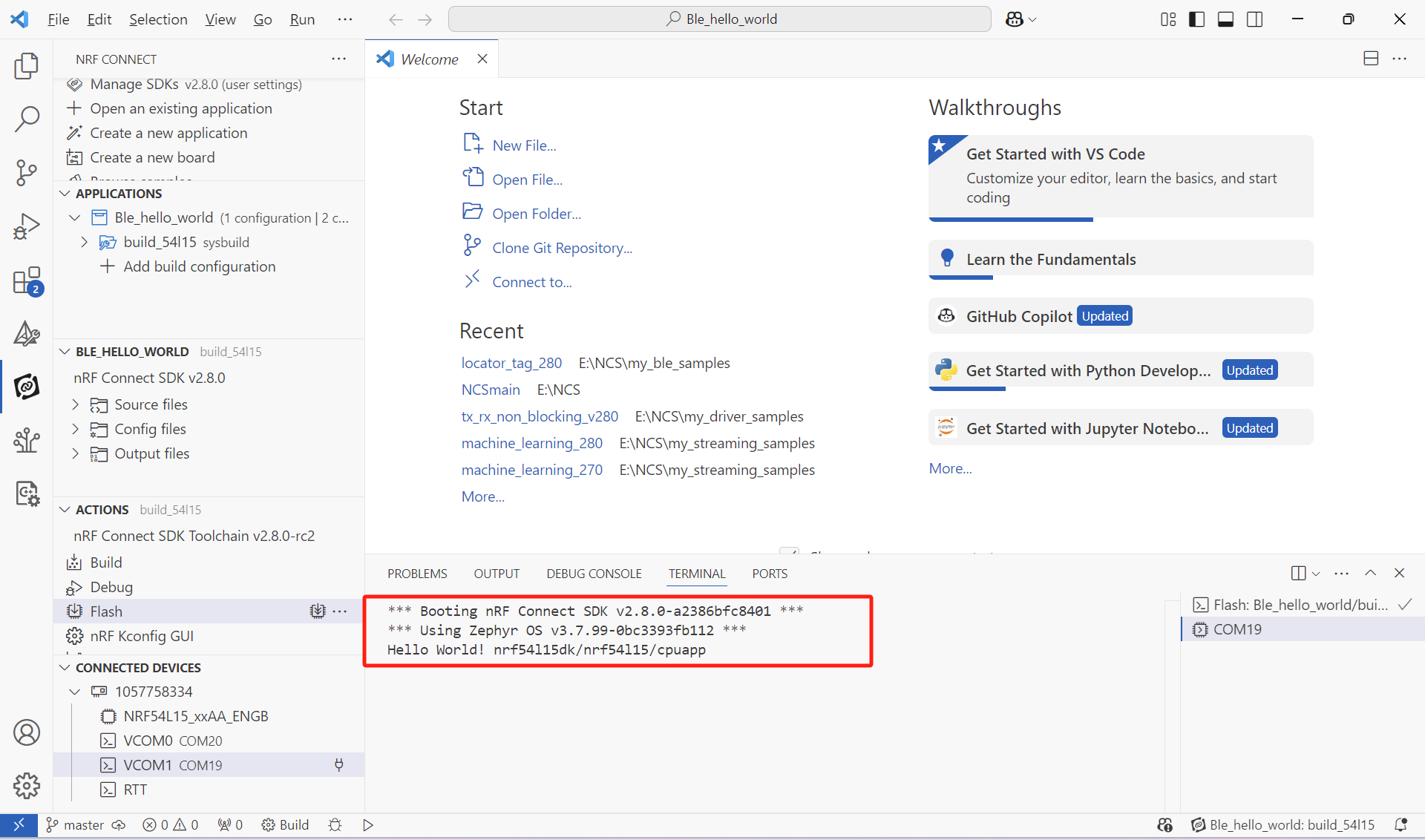 分别是NCS和Zephyr的版本,以及Hello World!和Boards的型号