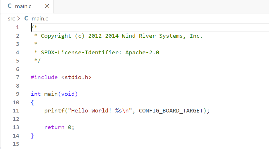 4、我们打开这个工程的main.c,可以看到这个工程非常简单,就是调用了printf来打印Hello World!和CONFIG_BOARD_TARGET这个宏