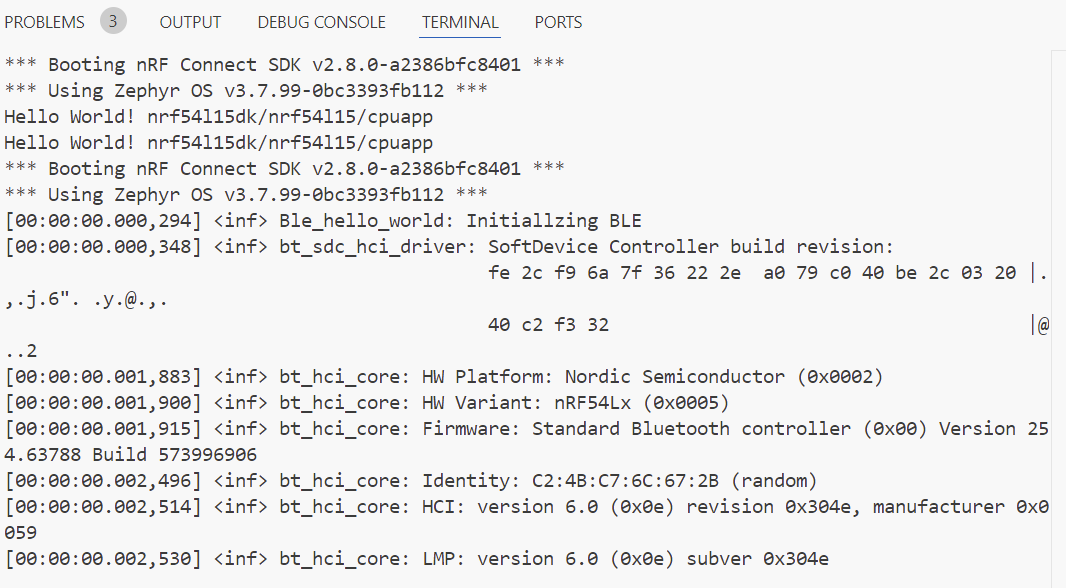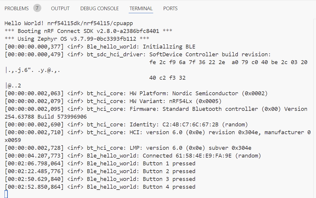 5、我们来编译并下载程序到nRF54L15DK中会看到程序进入了bluetooth_init 并在串口打印了LOG: