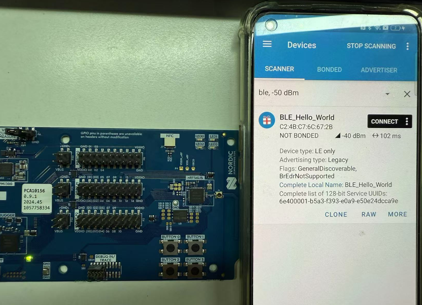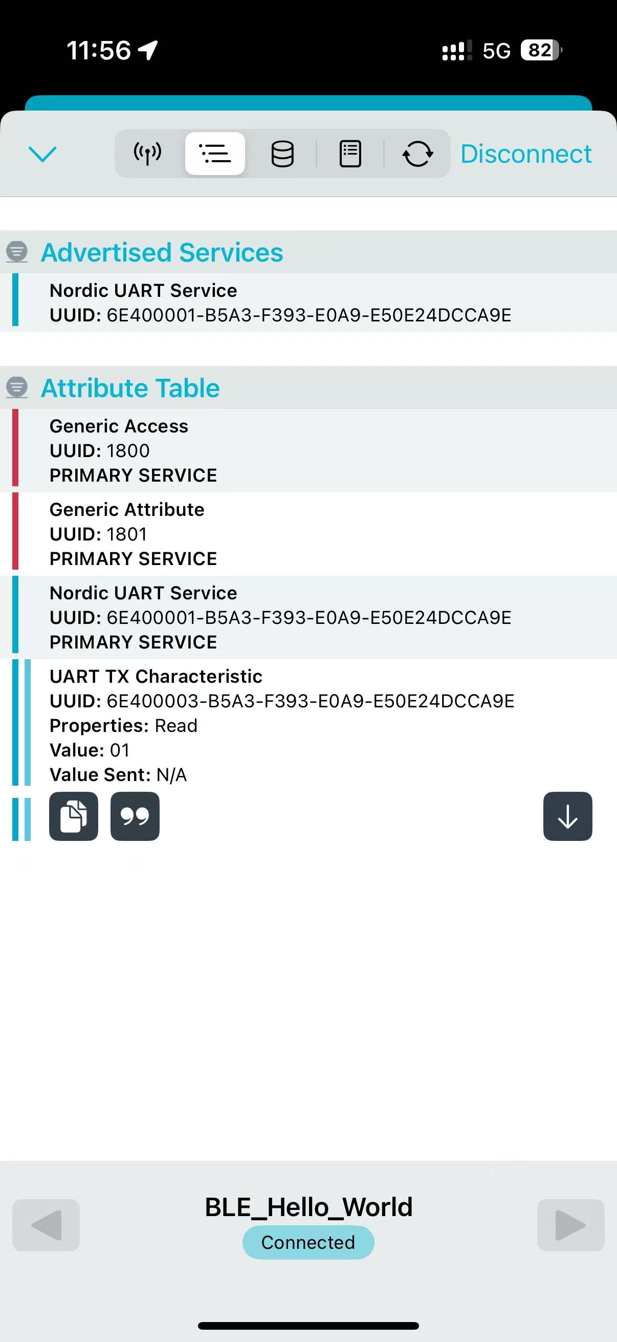 6、最后编译工程,并使用nRF Connect APP连接nRF54L15DK的广播,可以看到NUS Service下多了一个Read属性,当我们按下DK上的Button的时候,可以读取到对应的键值。