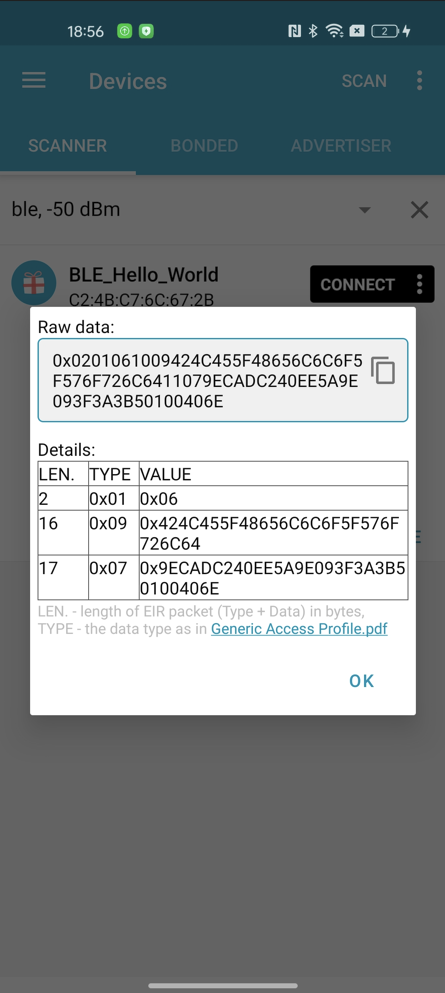5、最后我们编译工程来看一下有什么效果,我们可以使用nRF Connect app去查看一下广播数据