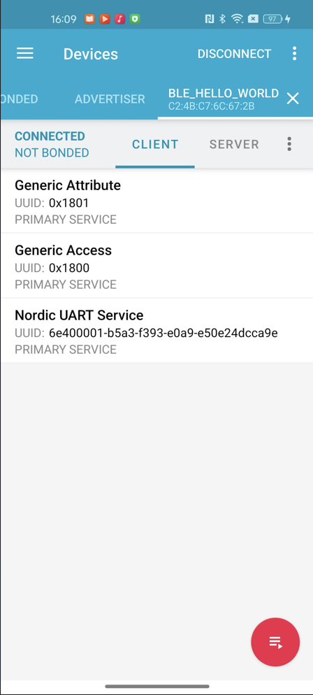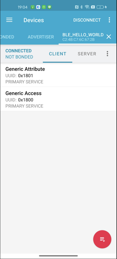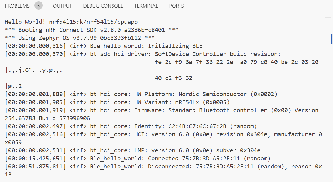 5、最后我们编译下载工程到nRF54L15的DK中,使用nRF Connect APP连接可以看到连接和断开之后分别打印了手机端的MAC地址