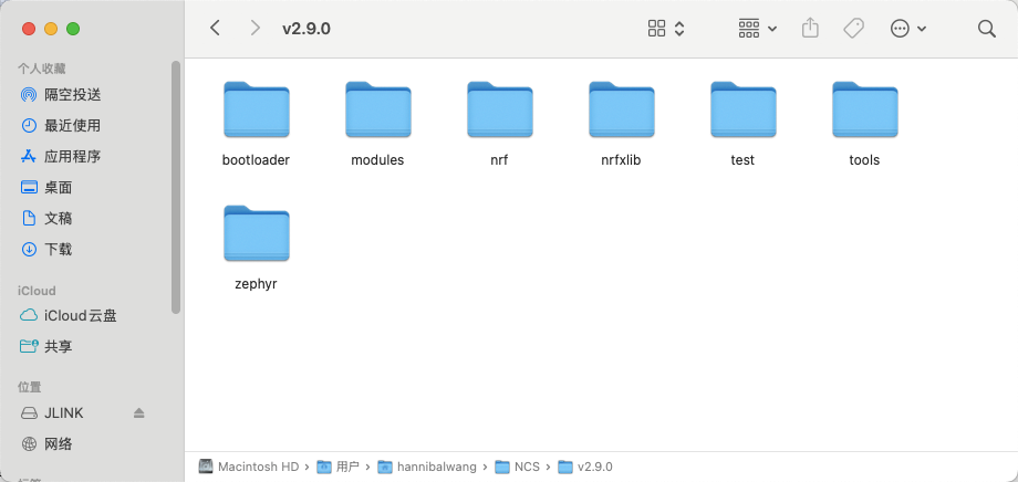 最后就是拉取NCS了,这部分其实和windows上是一样的,在磁盘中的任意位置新建一个文件夹取名为NCS,这里我是放在了用户下面,在NCS中我又新建了一个子文件夹用来存放SDK,这么做的目的是我将编译SDK依赖的toolchains和下载软件用的nrfutil脚本都放在了NCS目录下面。