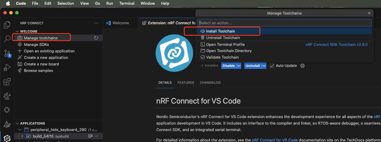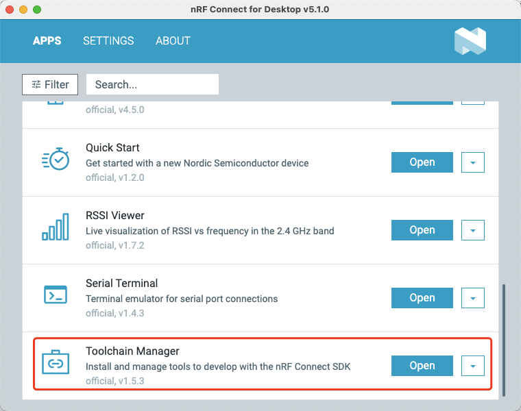 接着就是下载编译SDK需要用到的toolchain了,这里也和Windows一样,可以用nrf connect for desktop这个应用程序中的Toolchain Manager去下载