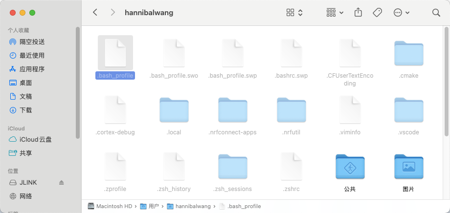 当然也可以在执行完 vi $HOME/.bash_profile之后,进入/Users/usename这个路径下,用command+shift+.这个快捷键让隐藏文件显示,然后用文本编辑.bash_profile,在里面加入【export PATH=$PATH:/Users/hannibalwang/NCS/nrfutil】再保存即可