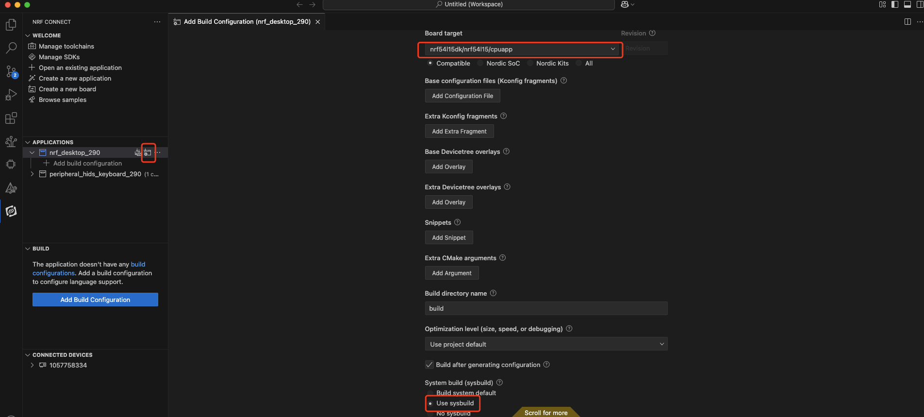 最后就是编译代码了,这里我用了nrf_desktop这个NCS中比较大的一个工程来测试编译速度,编译的时候选择nrf54l15为目标板