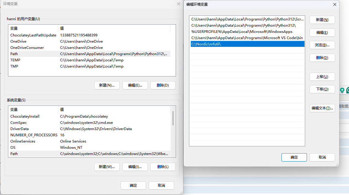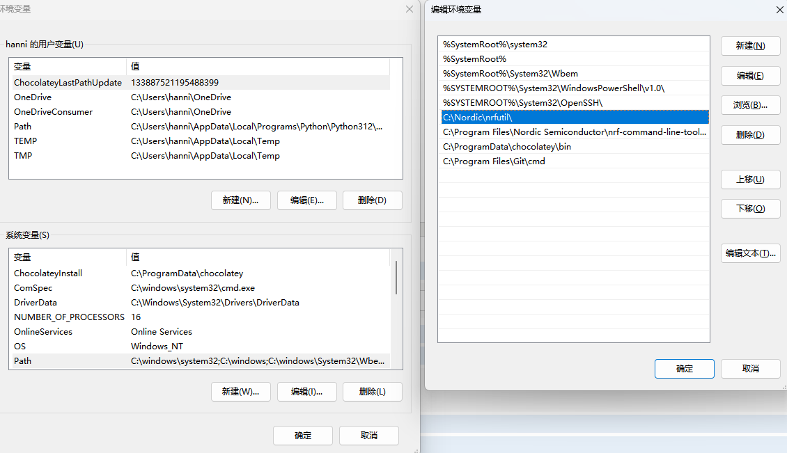 3、将nrfutil.exe放在任意路径下,然后将该路径添加到环境变量和用户变量中,例如我是将nrfutil.exe放在了C:\Nordic\nrfutil路径下
