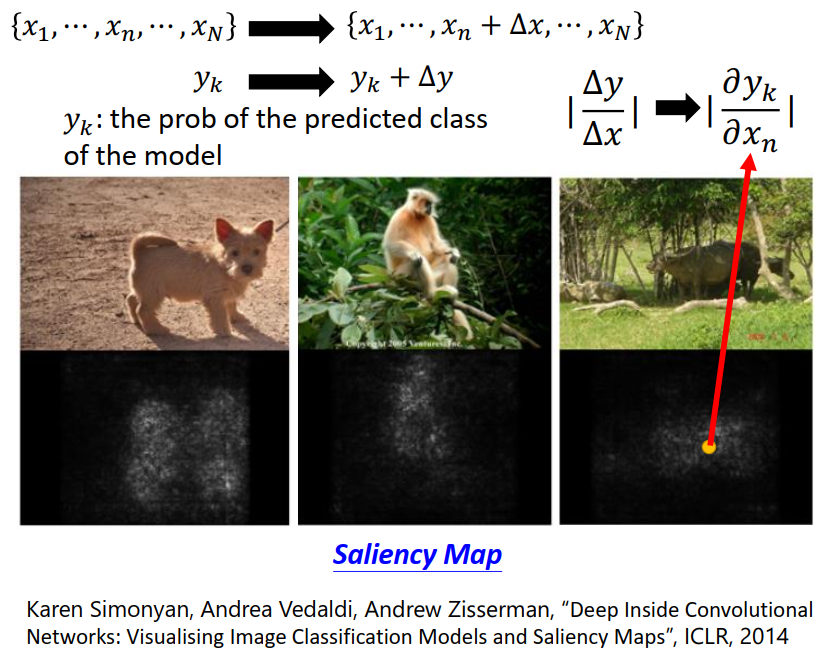 在input 向量的某个地方加上一部分,则得到的 yk(被辨识出来的机率) 也会产生变化,并求output 与 input 的变化比/偏微分,如果某个地方很重要,则在这个地方的微分也就越大。