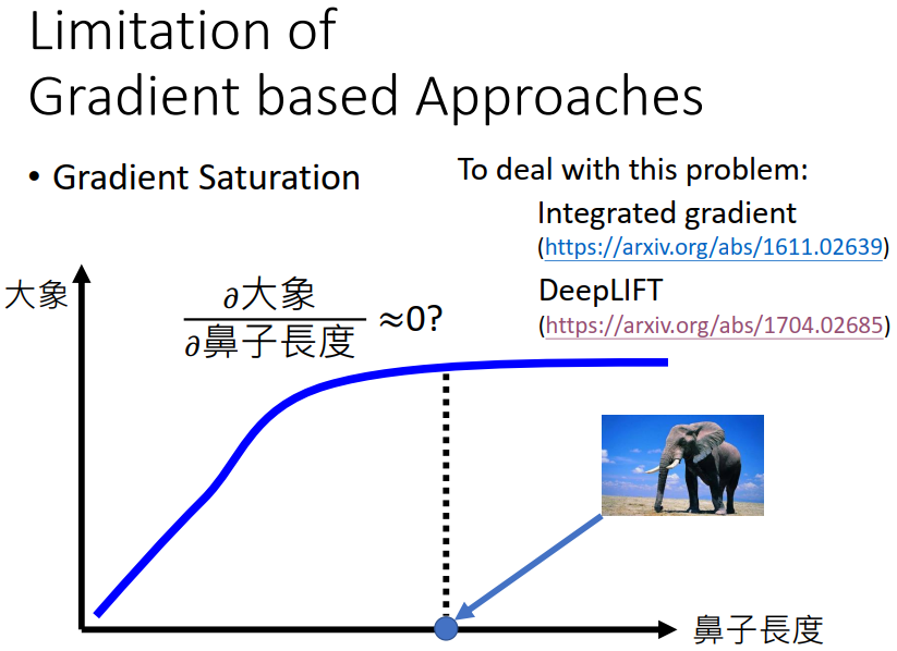 对于我们人类而言,大象的鼻子足够长我们就可以认为这是一只大象,就算再长也不会影响我们的判断了;但是对于机器,在长到一定程度时,求微分就会得到0,也就是机器会觉得,鼻子长度和input 是不是大象没有关系。显然不太对。