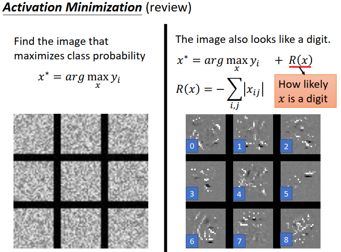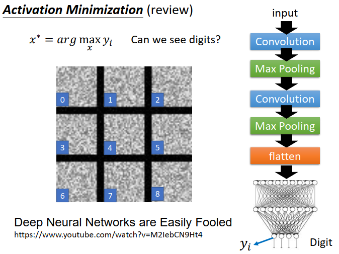 但是呢,前面攻击和防御的课里我们说过,一段浑浊的干扰,就能让机器把他判别为任何我们想要的东西,但是我们想要知道机器眼中的东西是什么样子,就要尽可能使得这个东西干净(除了这个东西没有别的东西)。比如一块白板上只有一个数字 8 其余的地方什么都没有。