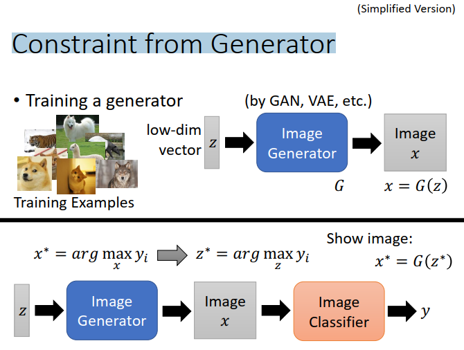 在上面,我们会给一个要求的东西,然后会找到一张图片使得机器认为这个图片就是我们要求的东西,现在我们在前面再加一步,给一个向量,让G产生一张image,然后把这个image丢进分类器中,让他会觉得这个图片是我们想要的东西的概率最大。 因此我们就会得到一个向量 使得 这个东西是我们想要的东西。然后把这个向量丢进G,产生的图片也就是我们想要的图片。