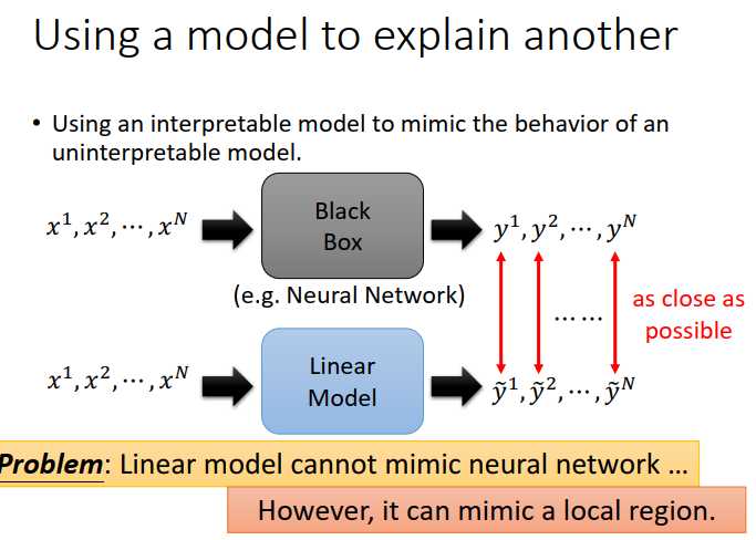 其次,建立另一个model,比如linear model,也用同样的input,并对此model进行训练,使得output与黑盒子的output 尽可能地相同。