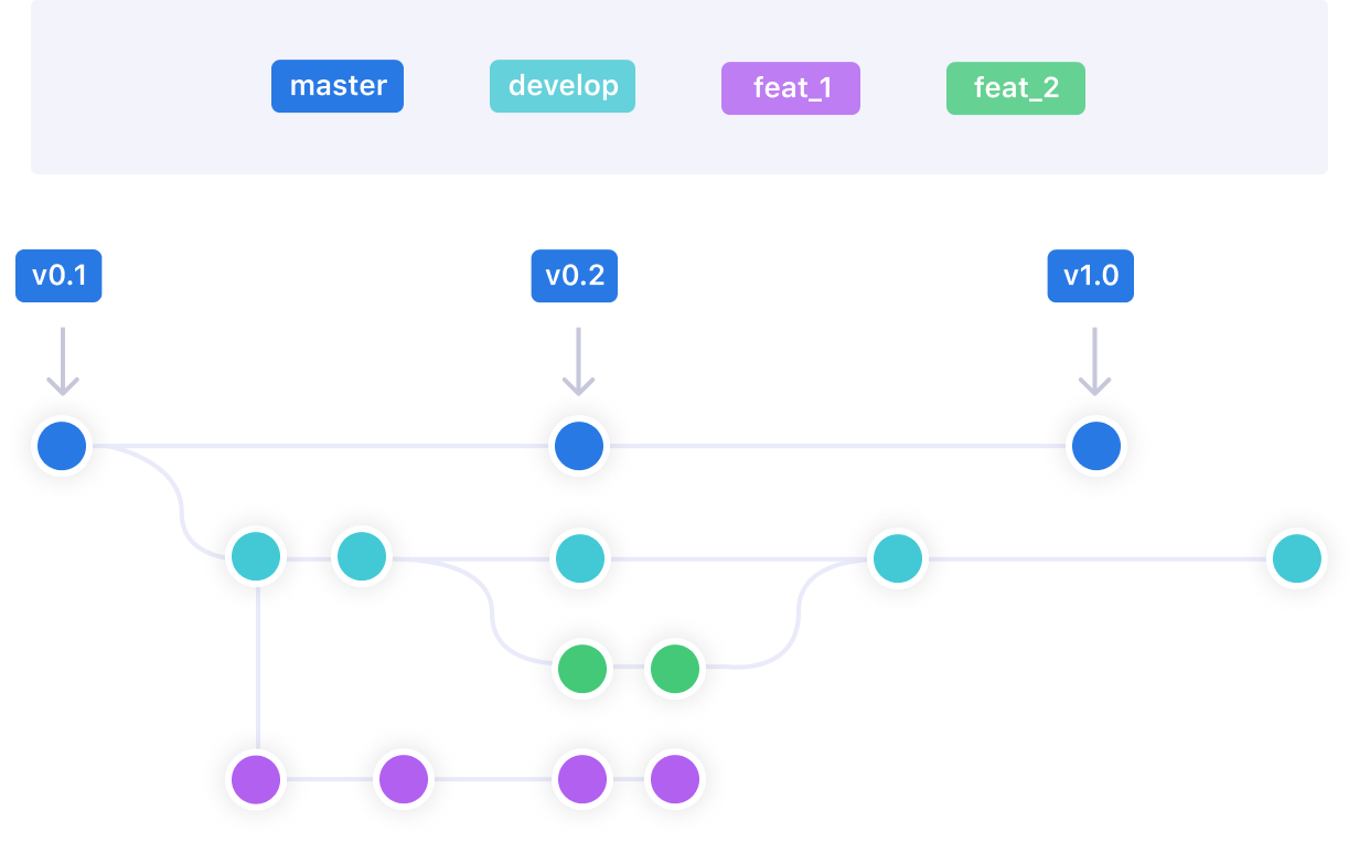 最常见的模式是master-dev分支模式,项目stable的代码放在master分支中,由不同的项目组成员维护自己负责的部分的branch和fork。