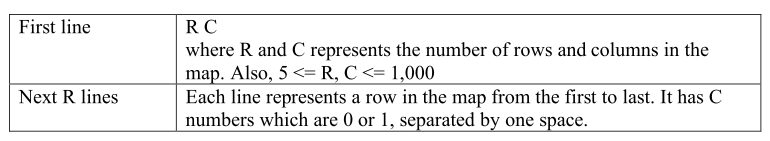 To facilitate the search process, the company creates a map in the form of a 2D table consisting R rows and C columns. In this 2D table, each entry represents a land of patch where 0 corresponds to a non-forest patch and 1 to a forest patch. Unfortunately, the map may have up to 1,000 x 1,000 entries and it is not a good idea to manually look for the largest allowed square region. This is where your skill comes into play. Write an efficient algorithm to find such a square region.