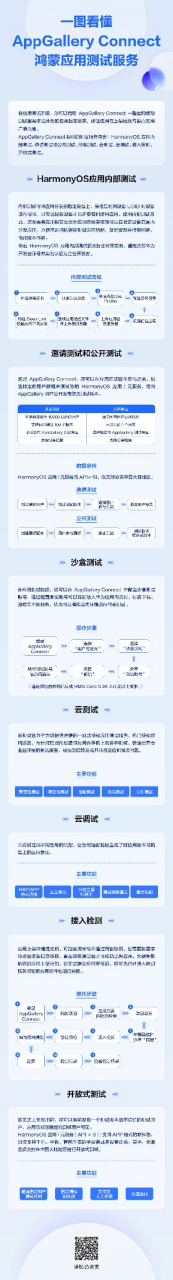 该海报介绍了AppGallery Connect内鸿蒙应用测试服务的类型以及步骤。