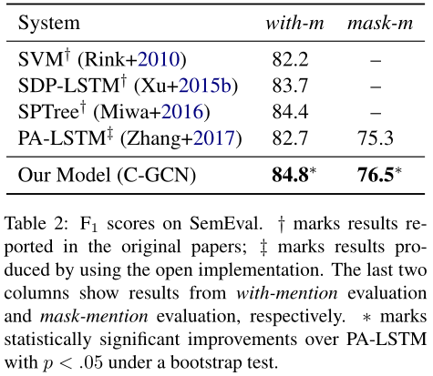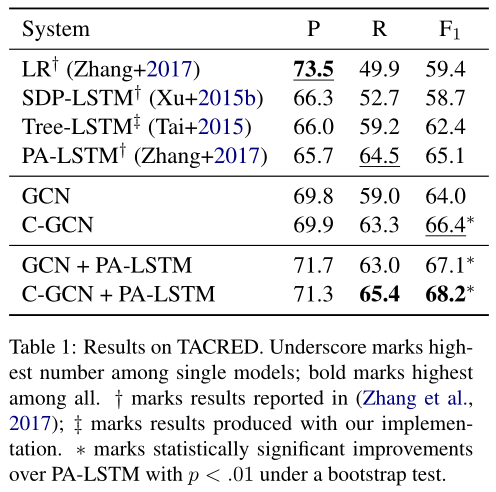 表1:在TACRED上的结果。在单个模型中,下划线表示最高;在所有模型中,粗体表示最高。†表示Zhang等人在2017年的实验结果;‡标志着我们的实验结果。∗表示PA-LSTM在p<0.01时,使用bootstrap测试取得了显著的提升。