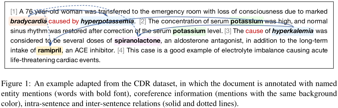 文档${\cal D}=\{ {\cal S_i}\}_{i=1}^{n_s}$,entity set ${\cal V}=\{ {\cal E_i}\}_{i=1}^{n_e}$,where ${\cal S}_i=\{ {w_j}\}_{j=1}^{n_w^i}$denotes the i-th sentence with $n^i_w$ words and ${\cal E}_i=\{ {m_j}\}_{j=1}^{n_m^i}$ is the i-th entity with $n_m^i$ mentity mentions.最终目标是预测每个实体对之间的所有句内和句间关系${\cal R}^{'}\in {\cal R}= \{ r_i\} _{i=1}^{n_r}$