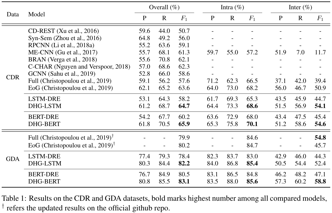 表1报告了我们提出的模型在两个数据集上与其他基线方法的比较结果。可以观察到,使用DHG的模型显著优于所有其他方法,并且DHG-BERT在所有数据集上都达到了最先进的F1分数。与CDR数据集上最新的基于图的方法EoG和GCNN相比,DHG-LSTM的F1得分分别提高了1.1%和6.1%。我们将性能提升归因于两种设计选择:(1)文档建模和多跳推理的分解,因为它使推理过程受益于序列和结构信息;(2) 我们的消息传播策略中的加权机制,因为它从异类相邻节点收集自适应数量的信息。