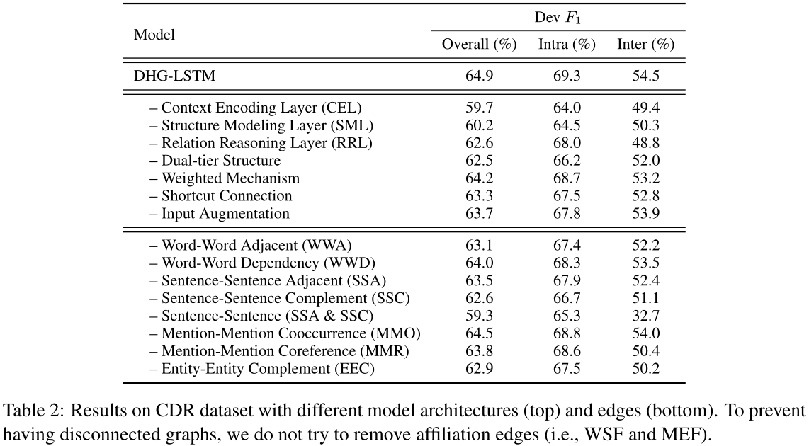 在这个实验中,我们研究了我们的DHG中不同边缘的影响。为此,我们单独烧蚀每种类型的边缘,并在表2底部报告结果。首先要注意的是,当WWA或SSA被删除时,F1的分数会显著下降,这可以解释为它们保持了文档的顺序结构,可以通过这两条边恢复原始文档。其次,WWD带来了显著的改进,证明了在文档级RE中利用句法依赖的有效性。第三,删除MMO对性能的影响较小,因为大部分句内关系可以通过上下文编码层来识别,而SML中的一个词-句-词链可以替代其部分角色。与此相反,MMR的丢弃显著降低了模型的性能,因为MMR使模型能够感知长期的和句间的提及指代关系。最后但同样重要的是,SSC和EEC有助于句子间关系的提取,同时也起到了使信息在图上快速传播的必要作用。不出意料的是,句与句之间连接的去除会导致性能的急剧下降,尤其是句间连接。总的来说,每个边缘都有自己的职责。各种边以相互促进的方式工作,这再次证实了我们的动机,即显式地捕获文档的内在结构对于文档级别的重新设计是必不可少的。