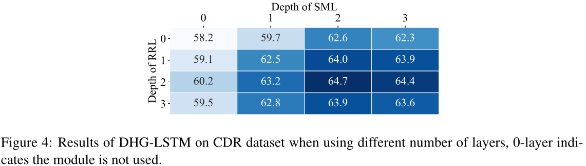 在本节中,我们将探讨模型深度(层数)的影响。对于DHG-LSTM模型中的SML和RRL,我们将它们的层数从0变为3。如图4所示,当SML和RRL的层都为2时,模型达到了最佳性能。在这种情况下,SML中的词节点通过句子-词链感知所有句子节点的信息,RRL支持二跳推理。因此,可以完全聚合用于检测关系的关键信息。然而,浅层模型和深层模型都不能很好地工作。一个可能的原因是仅仅从最近的邻居节点收集信息不足以识别两个实体之间的关系。相反,当层数为3时,同一个图中的任意两个节点都是可访问的,这可能会引入冗余信息并阻碍推理。