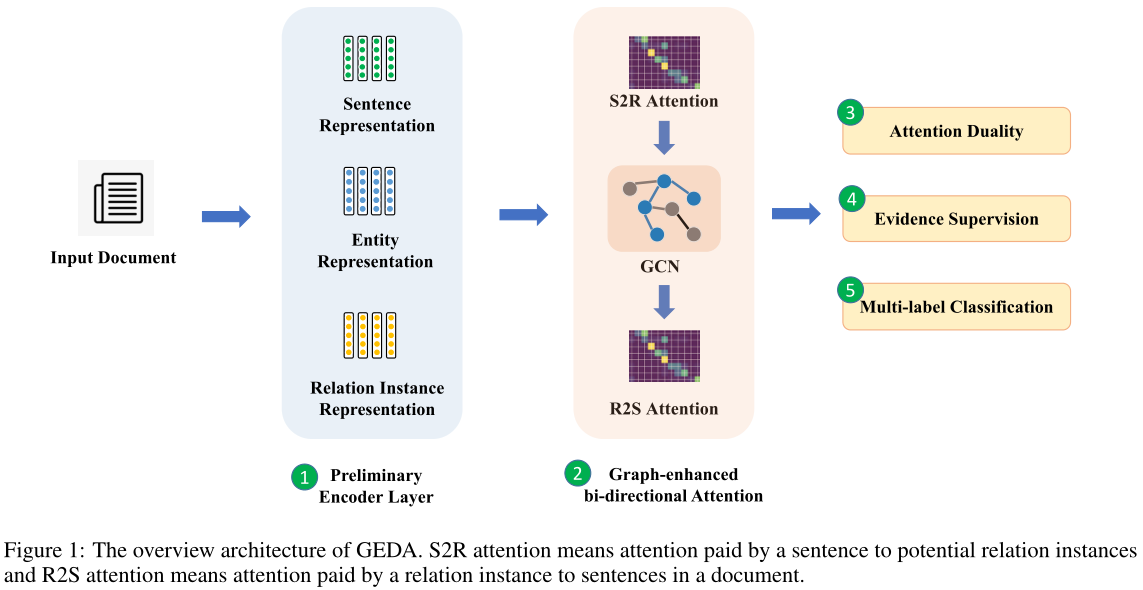 为了提高句子间的推理能力,我们提出用一个图增强的双注意网络Graph Enhanced Dual Attention network(GEDA)来刻画句子与潜在关系实例之间的复杂交互。在GEDA中,由句子-关系sentence-to-relation(S2R)注意产生的句子表示在被输入到句子-关系relation-to-sentence(R2S)注意之前,通过一个异构图卷积网络被细化和合成。基于S2R和R2S注意的自然对偶性,我们进一步设计了一个简单而有效的正则化器We further design a simple yet effective regularizer based on the natural duality of the S2R and R2S attention,在训练过程中,它的权值也由关系实例的支持证据supporting evidence of relation instances来监督。在现有的大规模数据集上进行的大量实验表明,该模型具有很好的性能,特别是在句间关系提取方面,同时神经网络的预测也具有很好的解释性和可观察性。