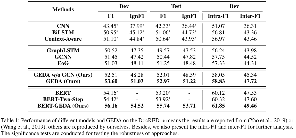 我们介绍了用于文档级关系抽取的神经结构GEDA。GEDA背后的直觉是更好地描述句子和关系实例之间的相互作用,从而改进整个文档的句间推理。GEDA的新颖性主要体现在基于图的句子表示精化和基于注意对偶和支持证据的两种简单而有效的正则化方法The novelty of GEDA mainly lies in the graph-based refinement of sentence representation and two simple yet effective regularizers based on attention duality and supporting evidence respectively。实验验证了图形增强的双重注意机制的优越性,特别是在句间关系提取方面。在未来,我们将研究更复杂的推理技术,针对更具体的句子间关系提取场景,例如,涉及常识推理。