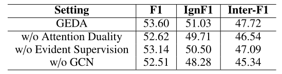 表2中的结果显示,三个组成部分都产生了显著的增强,验证了基于经典双向注意机制的三个新设计的有效性。同时,所有GEDA变体在IngF1和inter-F1上的性能下降比F1上更为显著。这一观察结果表明,这三个组成部分不仅提高了内部句子推理,而且为GEDA提供了更好的泛化能力,可以更准确地预测潜在关系实例。