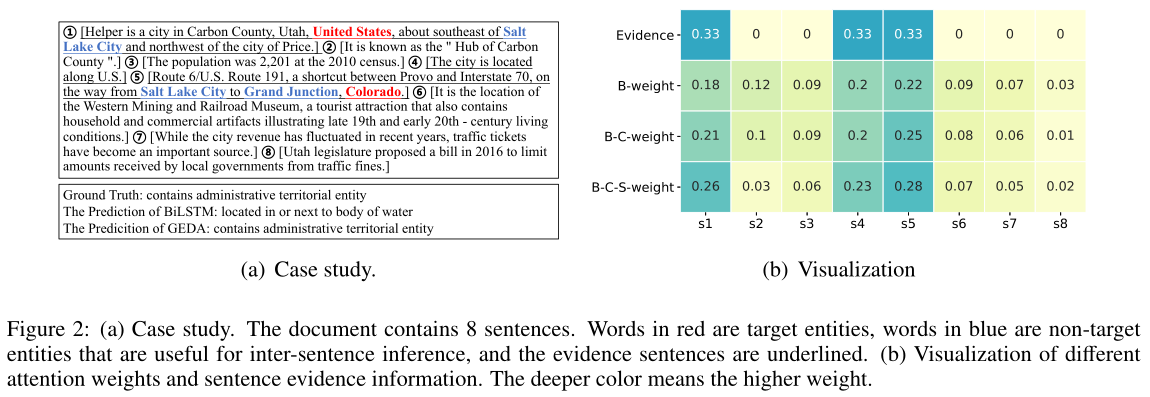 为了促进对神经预测的理解,我们使用DocRED的一份包含8个句子的文件进行案例研究,如图2(a)所示。实体对{United States,Colorado}有3个相关的句子。由于缺乏对多个句子的推理能力,BiLSTM错误地标注实例,而GEDA可以进行句间推理,从而预测实体对的正确关系。同时,我们对GEDA产生的R2S注意权重进行了可视化处理。如图2(b)所示,“证据”行显示了文档中句子的基本事实注意权重。B-weight是由双向注意生成的,B-C-weight是由具有对偶约束的双向注意生成的,B-C-S-weight是通过进一步添加支持证据生成的注意权重。如图2(b)所示,通过结合对偶约束和监督注意,正确的句子被赋予更多的权重。可视化结果不仅验证了正则化算法的有效性,而且揭示了本文提出的GEDA算法的可解释性。