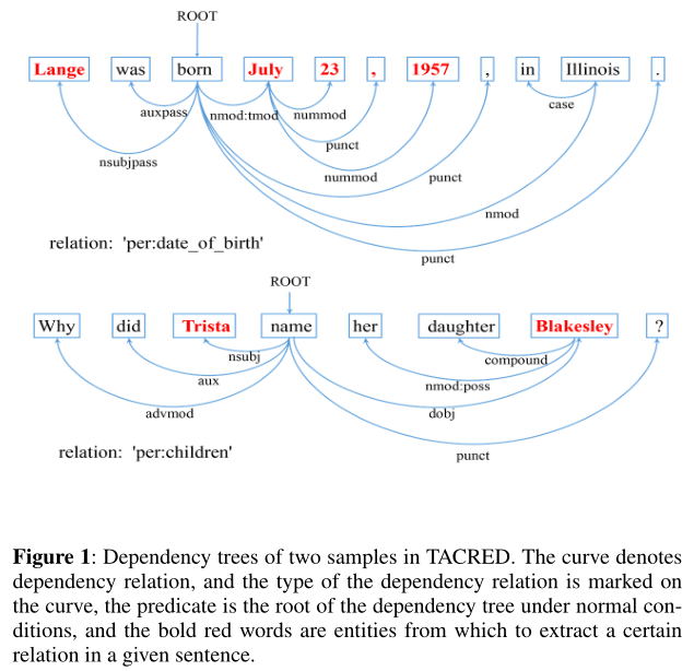 For both datasets, we use pre-trained 300-dimensional GloVe [18] to initialize word embedding, and randomly initialized POS embedding and NER embedding with 30 dimensions.The Bi-LSTM hidden size is set to 100, and WGCN hidden size is set to 200, which effectively enables residual computation. And we set the dropout rate 0.5, prune $k = 1$ [29]. For TACRED, We choose 2 layer WGCNs, initializing learning rate 1.0 with a decay rate 0.9. For SemEval, we set 3 layer WGCNs, 0.5 learning rate with a decay rate of 0.95. For both datasets, we trained our model for 150 epochs.