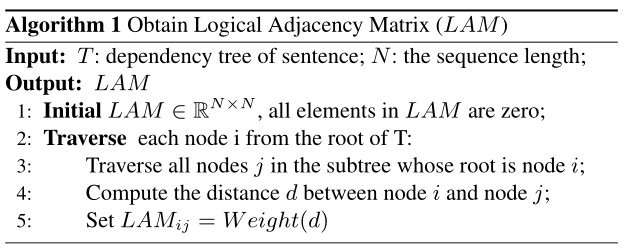 为了避免这种局限性,实现单层图网络的多跳特征融合,提出了一种加权图卷积网络(WGCN)。在该模型中,我们在依赖树中加入虚边来构造一个逻辑邻接矩阵logical adjacency matrix(LAM),它只需要一层WGCN就可以直接求出k阶邻域依赖。构造LAM的算法如算法1所示。