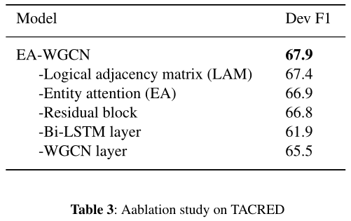 通过观察实验结果,我们发现我们的模型比其他模型至少提高了1.2F1。CNN获得了最高的精确度分数75.6和最低的Recall分数47.5,这导致了最低的F1分数。我们假设CNN可能倾向于对定义的关系进行精确分类,而对定义的类型和未定义的类型进行错误分类。CNN achieves the highest precision score 75.6 and a lowest recall score 47.5, which leads to a lowest F1 score. We hypothesize that CNN may tend to precisely classifying the defined relations while make misclassification between defined and undefined types.我们的EA-WGCN模型获得了最高的召回分数64.8和最高的F1 67.6。特别是与C-GCN相比,该模型在准确度、召回率和F1评分方面都有一定的提高。我们还通过平均5次随机初始化的softmax结果来运行我们的EA-WGCN模型的集成an ensemble of our EA-WGCN,这将F1分数提高了1%。