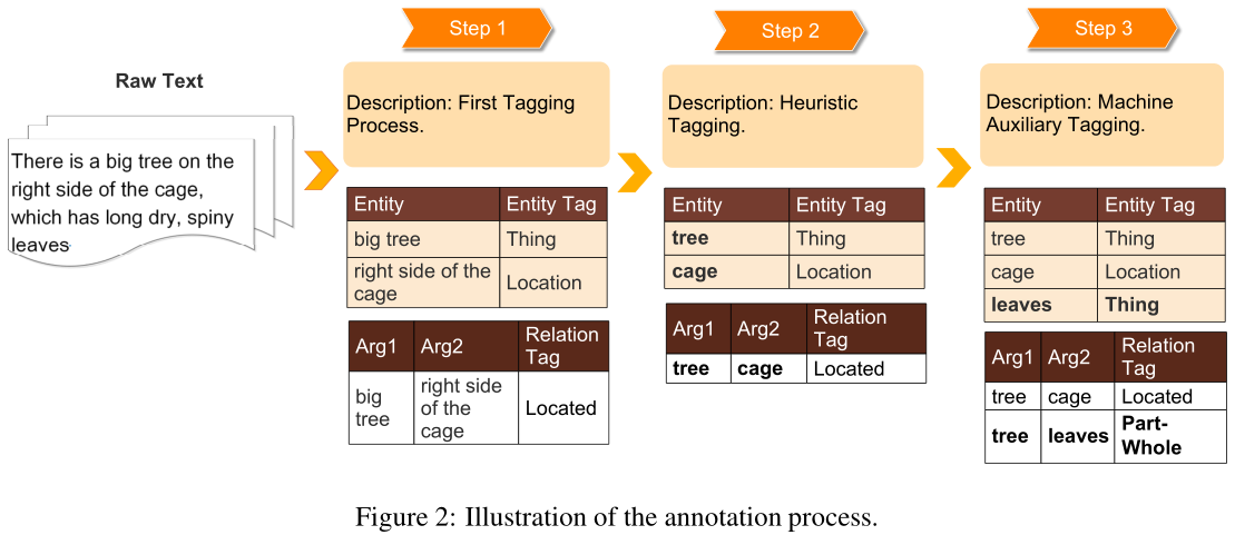 第一步:First T agging Process.第一次打包过程。我们首先尝试根据已定义的实体和关系标记对原始文章进行注释。在标注过程中,我们发现了数据不一致的问题。为了解决这个问题,我们设计了以下两个步骤。