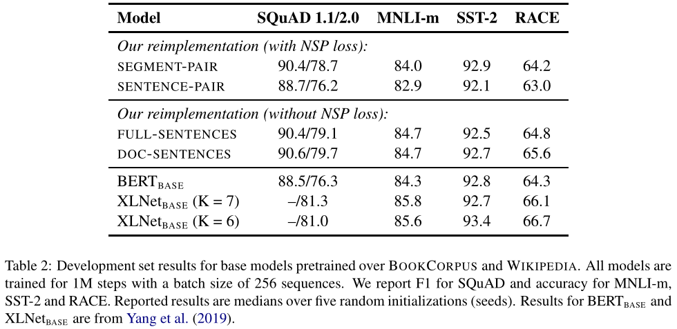 表2显示了四种不同设置的结果。我们首先将Devlin等人(2019)的原始段对SEGMENT-PAIR输入格式与句子对SENTENCE-PAIR格式进行比较;两种格式都保留NSP损失,但后者使用单句。我们发现使用单个句子会影响下游任务的表现,我们假设这是因为该模型无法学习长期依赖关系。