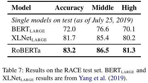 我们在表4中给出了我们的结果。在控制训练数据时,我们观察到RoBERTa比最初报告的$BERT_{LARGE}$结果有了很大的改进,这重申了我们在第4节中探讨的设计选择的重要性。