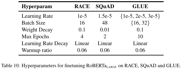 对于GLUE,我们考虑两种微调设置。在第一个设置(single-task,dev)中,我们针对每个GLUE任务分别微调RoBERTa,只使用相应任务的训练数据。我们考虑对每个任务进行有限的超参数扫描,batch_size∈{16,32},学习速率∈{1e−5,2e−5,3e−5},前6%的步骤linear warmup,然后线性衰减到0。我们对10个epochs进行微调,并基于每个任务在开发集中的评估指标执行早期停止。其他超参数保持与训练前相同。在这种情况下,我们报告了每个任务经过5次随机初始化后的中值开发集结果,没有模型集成。
