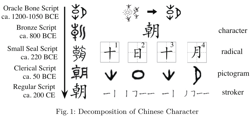 Char LSTM[17]被引入学习字符级序列,例如英语中的前缀和后缀。对于汉语来说,每个字符都有语义意义,这要归功于它的象形词根来自古代汉语,如图1所示[26]。图1的左半部分展示了汉字的演变过程朝” . 图1的右边部分演示了分解。这个字符“朝”, 它的意思是“早晨”,分解为4个偏旁,由12个笔划组成。