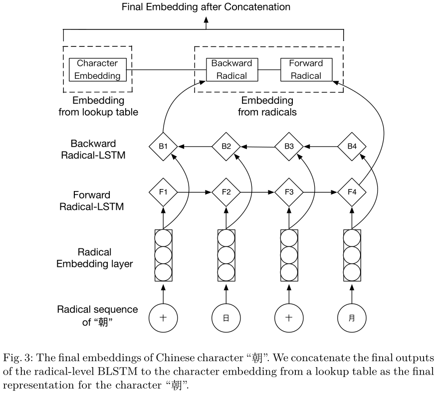 在现代汉语中,汉字通常包含几个部首。在MSRA数据集中,包括训练集和测试集,75.6%的字符有一个以上的部首。我们从网上的新华字典中找到汉字的部首。在简体中文中,字符内部的部首可能与原始形状不同。例如,汉字的第一个部首“腿”(腿)是“月”(moon),这是传统部首的简化形式“肉”(肉),而朝”(上午)也是“月”(moon)实际上是moon的意思。为了处理这些变体,我们替换了最重要的简化词根,也被称为bù(意思是“categories”),以其传统的部首形状恢复其原始含义。汉字的简化部首和传统部首也可以在在线新华字典中找到。对于单部首字符,我们只使用其自身作为其部首部分。在进行替换后,我们得到所有组成部首,我们用所有的部首来建立每个汉字的部首列表。由于一个字符的每个部首都有一个唯一的位置,我们将一个字符的部首视为书写顺序中的一个序列。我们使用部首级双向LSTM来捕获部首信息。图3显示了如何获得字符的最终输入嵌入。