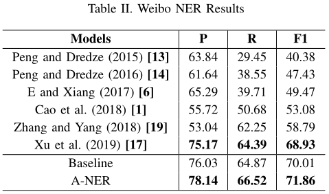 在表II的第二部分,我们给出了基线(即A-NER去除自我注意层)和A-NER的结果。我们观察到,自我注意机制可以有效地提高模型的性能。