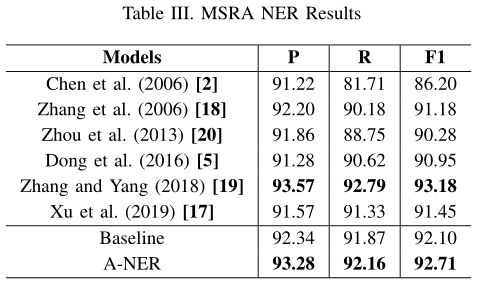 表三显示了MSRA数据集上的实验结果。现有最先进的系统[19]研究了一种晶格结构的LSTM模型,以将词典信息纳入神经网络。该模型的准确率为93.57%,召回率为92.79%,分数为93.18%。然而,由于它使用的是外部的词汇数据,因此由于一些噪声词的存在,词汇的质量会影响到汉语NER的性能。