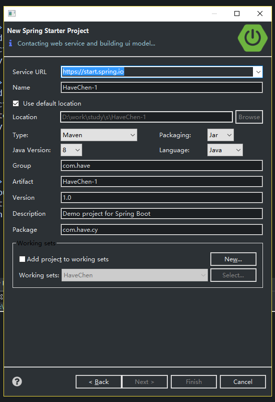 解压后,使用eclipse,Import -> Existing Maven Projects -> Next ->选择解压后的文件夹-> Finsh,这样也完成了SpringBoot项目的新建;