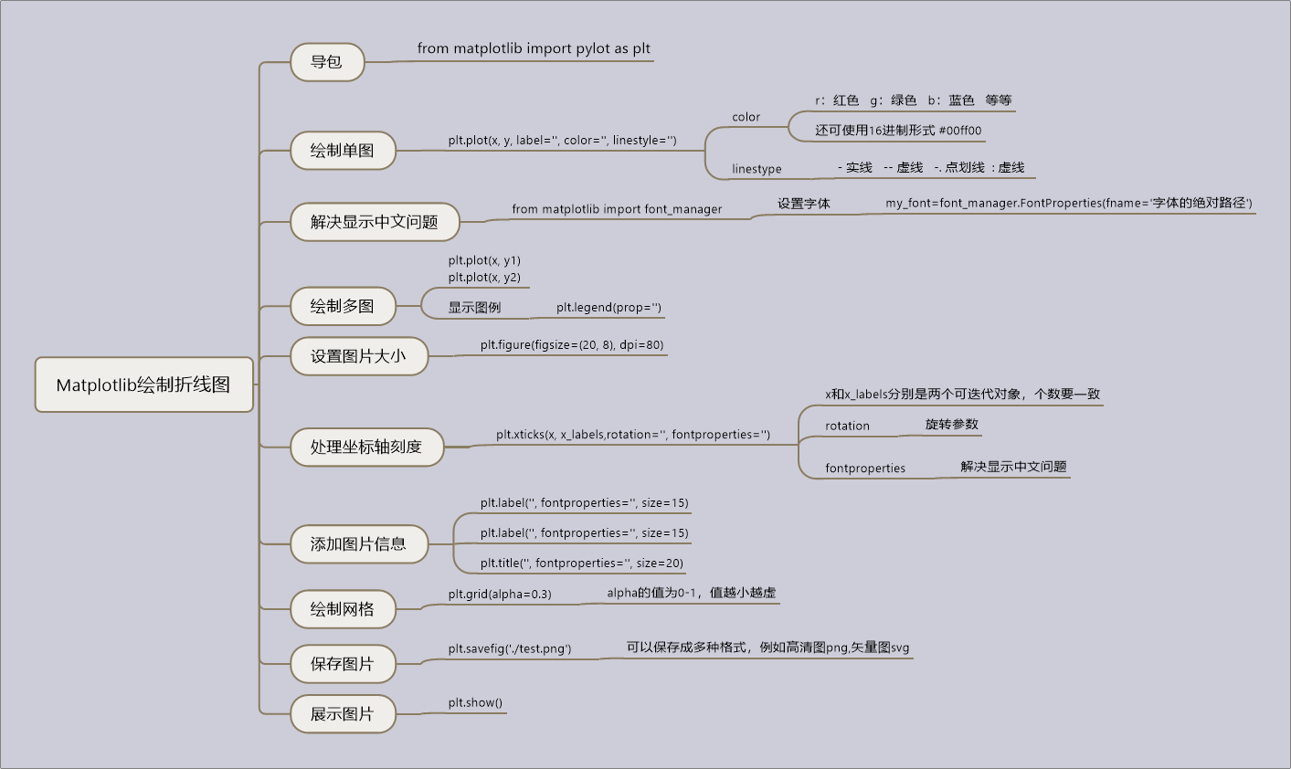 今天学习了使用matplotlib绘制简单的折线图,思维导图如下: