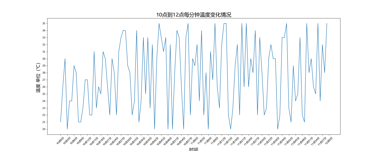 1 # Author:K 2 """ 3 绘制10点到12点每分钟温度变化情况 4 """ 5 6 from matplotlib import pyplot as plt 7 import random 8 from matplotlib import font_manager 9 10 # 设置字体 11 my_font = font_manager.FontProperties(fname=r'C:\Windows\Fonts\msyh.ttc') 12 13 a = [random.randint(20, 35) for i in range(120)] 14 x = range(120) 15 # 设置长宽,DPI 16 plt.figure(figsize=(20, 8), dpi=80) 17 18 # 设置x,y轴刻度 19 x_labels = ['10点%s分' % x for x in range(60)] 20 x_labels += ['11点%s分' % x for x in range(60)] 21 x_labels += ['12点0分'] 22 23 x_labels = x_labels[::3] # x_labels有41个 24 _x = list(range(121))[::3] # 为了显示12点0分,所以range里面写121,正好41个 25 plt.xticks(_x, x_labels, rotation=45, fontproperties=my_font) 26 plt.yticks(range(20, 36)) 27 28 # 添加描述信息 29 plt.xlabel('时间', fontproperties=my_font, size=17) 30 plt.ylabel('温度 单位(℃)', fontproperties=my_font, size=17) 31 plt.title('10点到12点每分钟温度变化情况', fontproperties=my_font, size=20) 32 33 # 绘图 34 plt.plot(x, a) 35 36 37 # 保存图片 38 plt.savefig('./weather.png') 39 plt.show()