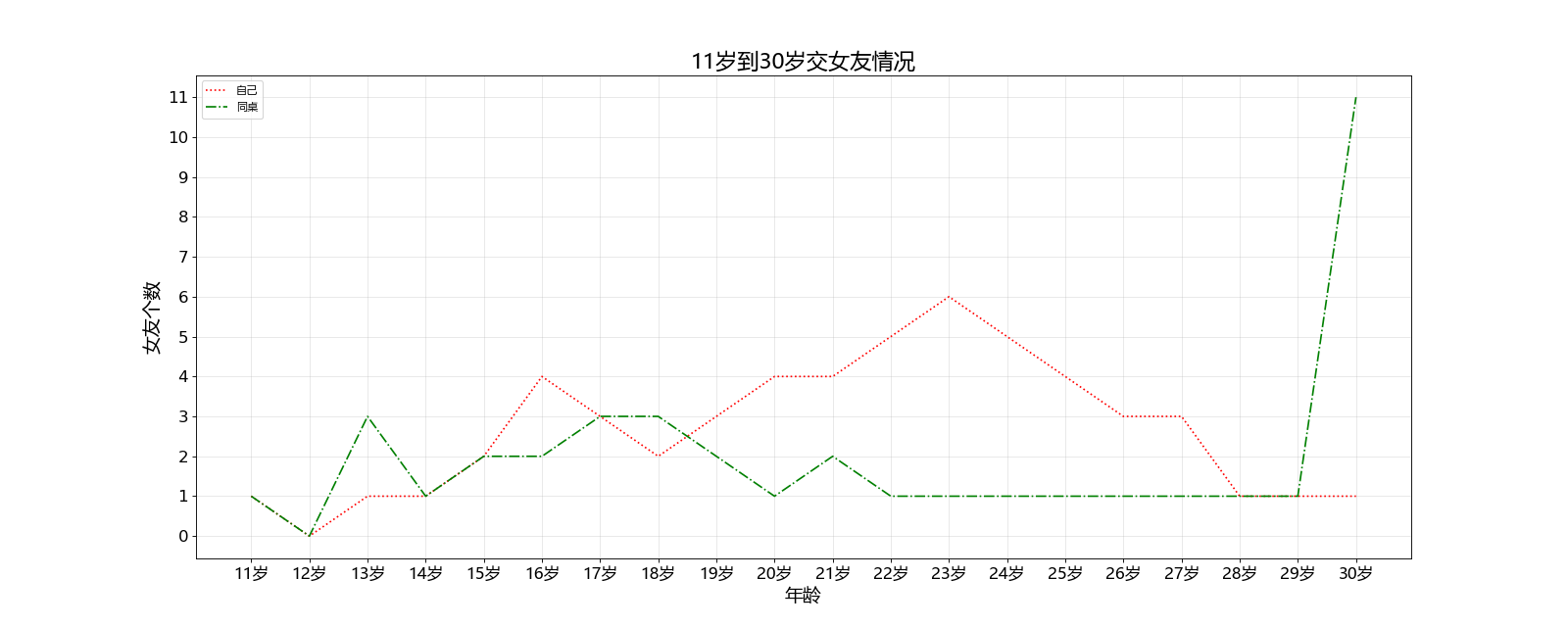 1 # Author:K 2 """ 3 统计11岁到30岁交女友情况 4 """ 5 6 from matplotlib import pyplot as plt 7 from matplotlib import font_manager 8 9 # 设置字体 10 my_font = font_manager.FontProperties(fname=r'C:\Windows\Fonts\msyh.ttc') 11 12 y1 = [1, 0, 1, 1, 2, 4, 3, 2, 3, 4, 4, 5, 6, 5, 4, 3, 3, 1, 1, 1] 13 y2 = [1, 0, 3, 1, 2, 2, 3, 3, 2, 1, 2, 1, 1, 1, 1, 1, 1, 1, 1, 11] 14 x = range(11, 31) 15 16 # 设置图片大小,DPI 17 plt.figure(figsize=(20, 8), dpi=80) 18 19 # 绘图 20 plt.plot(x, y1, label='自己', color='r', linestyle=':') 21 plt.plot(x, y2, label='同桌', color='g', linestyle='-.') 22 23 # 设置x,y轴刻度 24 plt.xticks(x, ['%s岁' % s for s in x], fontproperties=my_font, size=15) 25 plt.yticks(range(min(min(y1), min(y2)), max(max(y1), max(y2))+1), size=15) 26 27 # 添加图片信息 28 plt.xlabel('年龄', fontproperties=my_font, size=17) 29 plt.ylabel('女友个数', fontproperties=my_font, size=17) 30 plt.title('11岁到30岁交女友情况', fontproperties=my_font, size=20) 31 32 # 显示图例 33 plt.legend(prop=my_font) 34 35 # 绘制网格alpha参数为透明度,1为最大值,是实线 36 plt.grid(alpha=0.3) 37 38 # 保存图片 39 plt.savefig('./gf.png') 40 41 # 显示图片 42 plt.show()