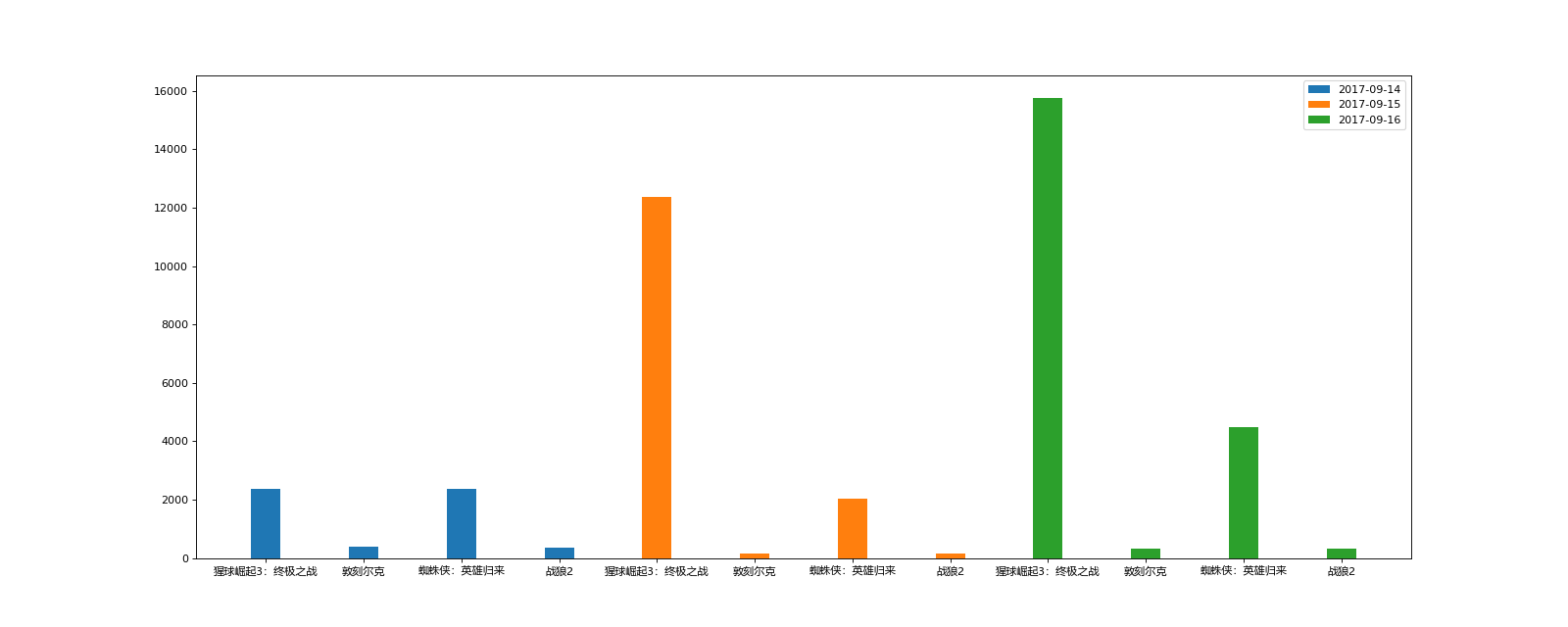 1 # Author:K 2 from matplotlib import pyplot as plt 3 from matplotlib import font_manager 4 5 my_font = font_manager.FontProperties(fname=r'C:\Windows\Fonts\msyh.ttc') 6 7 a = ['猩球崛起3:终极之战', '敦刻尔克', '蜘蛛侠:英雄归来', '战狼2'] 8 b_16 = [15746, 312, 4497, 319] 9 b_15 = [12357, 156, 2045, 168] 10 b_14 = [2358, 399, 2358, 362] 11 12 # 设置图行大小,DPI 13 plt.figure(figsize=(20, 8), dpi=80) 14 # # 绘制三次条形图 15 # plt.bar(range(len(a)), b_14, width=0.3, label='2017-09-14') 16 # plt.bar(range(len(a), len(a) * 2), b_15, width=0.3, label='2017-09-15') 17 # plt.bar(range(len(a) * 2, len(a) * 3), b_16, width=0.3, label='2017-09-16') 18 # 19 # # 修改x轴的刻度 20 # x_labels = a + a + a 21 # plt.xticks(range(len(x_labels)), x_labels, fontproperties=my_font) 22 # # 显示图例 23 # plt.legend() 24 # # 保存图片 25 # plt.savefig('./bar_movie_comp1.png') 26 # # 展示图形 27 # plt.show() 28 29 # 第二种方式:绘制三次条形图 30 bar_width = 0.2 31 x_14 = range(len(a)) 32 x_15 = [i + bar_width for i in x_14] 33 x_16 = [i + bar_width * 2 for i in x_14] 34 35 plt.bar(x_14, b_14, width=bar_width, label='2017-09-14') 36 plt.bar(x_15, b_15, width=bar_width, label='2017-09-15') 37 plt.bar(x_16, b_16, width=bar_width, label='2017-09-16') 38 39 # 修改x轴的刻度 40 plt.xticks(x_15, a, fontproperties=my_font, size=15) 41 # 显示图例 42 plt.legend() 43 # 保存图片 44 plt.savefig('./bar_movie_comp2.png') 45 # 展示图形 46 plt.show()