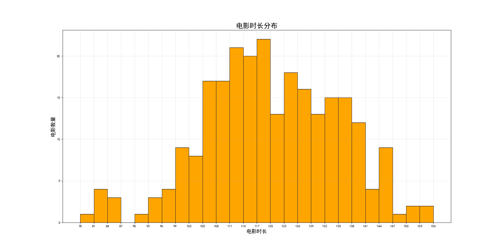 1 # Author:K 2 from matplotlib import pyplot as plt 3 4 # 解决中文显示问题 5 plt.rcParams['font.sans-serif'] = ['SimHei'] 6 # plt.rcParams['axes.unicode_minus'] = False # 这句话暂时还不需要用到 7 8 a = [131, 98, 125, 131, 124, 139, 131, 117, 128, 108, 135, 138, 131, 102, 107, 114, 119, 128, 121, 142, 127, 130, 124, 9 101, 110, 116, 117, 110, 128, 128, 115, 99, 136, 126, 134, 95, 138, 117, 111, 78, 132, 124, 113, 150, 110, 117, 86, 10 95, 144, 105, 126, 130, 126, 130, 126, 116, 123, 106, 112, 138, 123, 86, 101, 99, 136, 123, 117, 119, 105, 137, 11 123, 128, 125, 104, 109, 134, 125, 127, 105, 120, 107, 129, 116, 108, 132, 103, 136, 118, 102, 120, 114, 105, 115, 12 132, 145, 119, 121, 112, 139, 125, 138, 109, 132, 134, 156, 106, 117, 127, 144, 139, 139, 119, 140, 83, 110, 102, 13 123, 107, 143, 115, 136, 118, 139, 123, 112, 118, 125, 109, 119, 133, 112, 114, 122, 109, 106, 123, 116, 131, 127, 14 115, 118, 112, 135, 115, 146, 137, 116, 103, 144, 83, 123, 111, 110, 111, 100, 154, 136, 100, 118, 119, 133, 134, 15 106, 129, 126, 110, 111, 109, 141, 120, 117, 106, 149, 122, 122, 110, 118, 127, 121, 114, 125, 126, 114, 140, 103, 16 130, 141, 117, 106, 114, 121, 114, 133, 137, 92, 121, 112, 146, 97, 137, 105, 98, 117, 112, 81, 97, 139, 113, 134, 17 106, 144, 110, 137, 137, 111, 104, 117, 100, 111, 101, 110, 105, 129, 137, 112, 120, 113, 133, 112, 83, 94, 146, 18 133, 101, 131, 116, 111, 84, 137, 115, 122, 106, 144, 109, 123, 116, 111, 111, 133, 150] 19 20 # 设置图形大小,DPI 21 plt.figure(figsize=(20, 10), dpi=80) 22 23 d = 3 # 定义组距 24 num_bins = (max(a) - min(a)) // d # 计算组数,这里要注意的是如果不能整除的话,图形会左移或者右移,不会对应网格 25 26 # 绘制直方图 27 plt.hist(a, num_bins, rwidth=1, edgecolor='black', color='orange') 28 29 # 设置x轴刻度 30 plt.xticks(range(min(a), max(a) + d, d)) 31 32 # 绘制网格 33 plt.grid(alpha=0.3) 34 35 # 设置标题,x轴,y轴信息 36 plt.xlabel('电影时长', size=15) 37 plt.ylabel('电影数量', size=15) 38 plt.title('电影时长分布', size=20) 39 40 # 保存图形 41 plt.savefig('./hist_demo.png') 42 43 # 展示图形 44 plt.show()