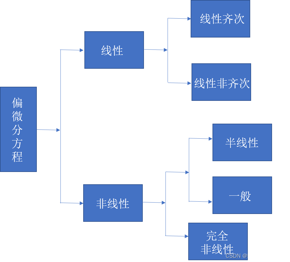 偏微分方程:我们将只含有未知多元函数及其偏导数的方程称为偏微分方程。方程中出现的位置函数偏导数的最高阶数称为偏微分方程的阶。如果方程中对于未知函数和它的所有偏导数都是线性的,这样的方程称为线性偏微分方程,否则称其为非线性偏微分方程。特别的,在非线性偏微分方程中,关于未知数的所有最高阶偏导数都是线性的偏微分方程称为拟线性偏微分方程。在拟线性偏微分方程中,由最高阶偏导数组成的部分叫做主部。如果主部的系数都是常数或是自变量的已知函数的偏微分方程称为半线性偏微分方程。而既不是线性也不是拟线性的偏微分方程称为非线性偏微分方程。