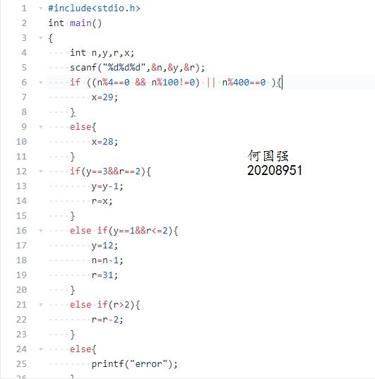 题目内容描述:本题目要求读入年、月、日,然后判断前天日期。在一行中输入年、月、日。(日期为有效日期)