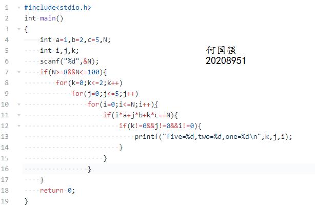题目内容描述:输入我们需要兑换的金钱数,然后我们用这些面值5元,2元和1元的人民币来兑换,要求每一种面值都至少有1张,然后输出有多少种兑换方式。输入在一行中给出待换的零钱数额(大于等于8小于等于100)